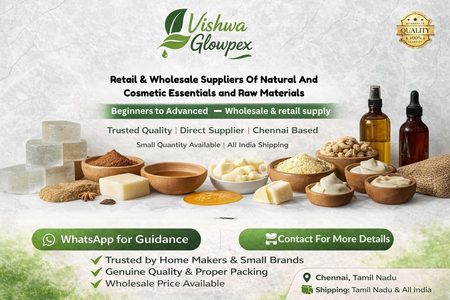 Along with materials, we offer product guidance and formulation support, making it easier for both beginners and professionals to craft their own signature products. Our aim is to be your reliable partner for all cosmetic and soap-making essentials.